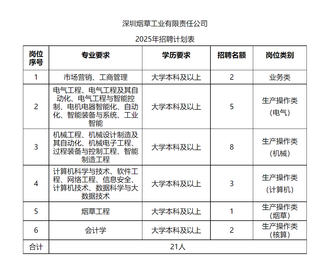 共计招聘21人。具体招聘人数及专业等要求见《深圳烟草工业有限责任公司2025年招聘计划表》(附件1)。